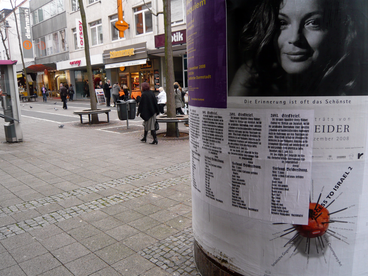Lors d'une résidence d'un mois à Darmstadt, ville de Georg Büchner, j'ai réalisé un fac- simile de l'avis de recherche lancé à l'encontre de celui-ci en 1835. Il était intéressant d'aller placarder ce texte historique, en gothique dans sa ville en 2006. Büchner poète, étudiant en médecine était recherché pour activités subversives. |